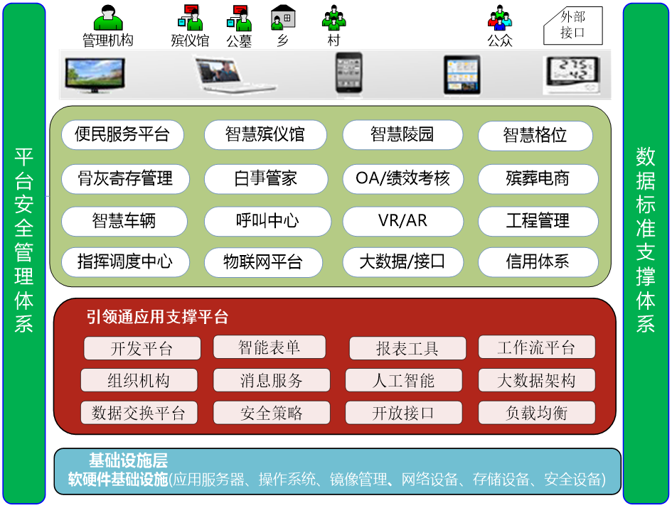 百年生态智慧殡葬平台是以民生服务和创新管理为建设主体目标,充分融合线上和线下资源,实现便民、利民、惠民的殡葬民生服务;建设以业务和服务为基础的智慧殡葬全流程业务管理系统,整合实现的终端设备、云资源、软件资源和硬件资源,引入监控、生物识别和人工智能等物联网感知设备,打造的一个智慧化、物联化和大数据的智慧殡葬平台。