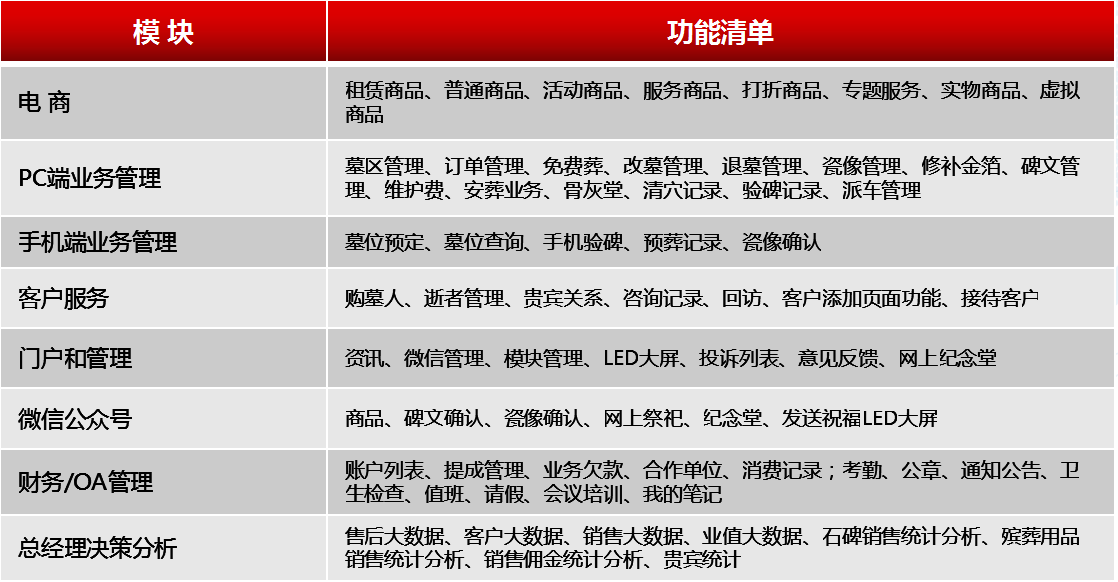 百年生态智慧陵园系统是由十多年陵园从业人员和具有互联网开发经验的团队倾力打造,旨在互联网时代下提升陵园/公墓企业在营销、创新、服务和管理等方面的水平。系统是基于自主研发的LEADCloud互联网+平台技术,打通电脑端、移动端和公众端,拥有智陵园业务系统、客户及渠道管理系统、便民服务平台、协同办公OA系统、陵园工程项目管理系统、物联网设备运营服务、智能设备和其他配套智能化系统,是针对陵园行业内部精细管理和外部精准服务的新一代智慧陵园系统。