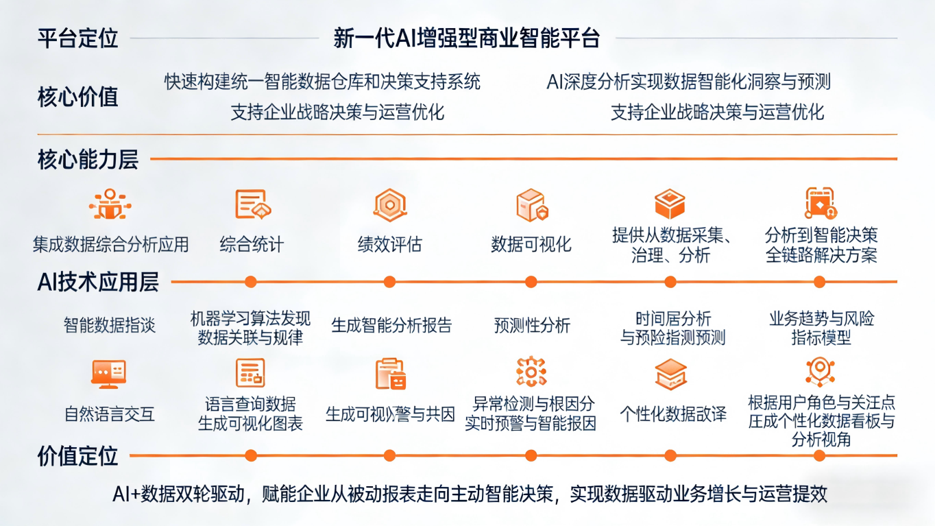 平台通过集成数据综合分析应用、综合统计、绩效评估、业务预警与数据可视化等核心能力,为企业提供从数据采集、治理、分析到智能决策的全链路解决方案。结合AI技术,平台可实现: