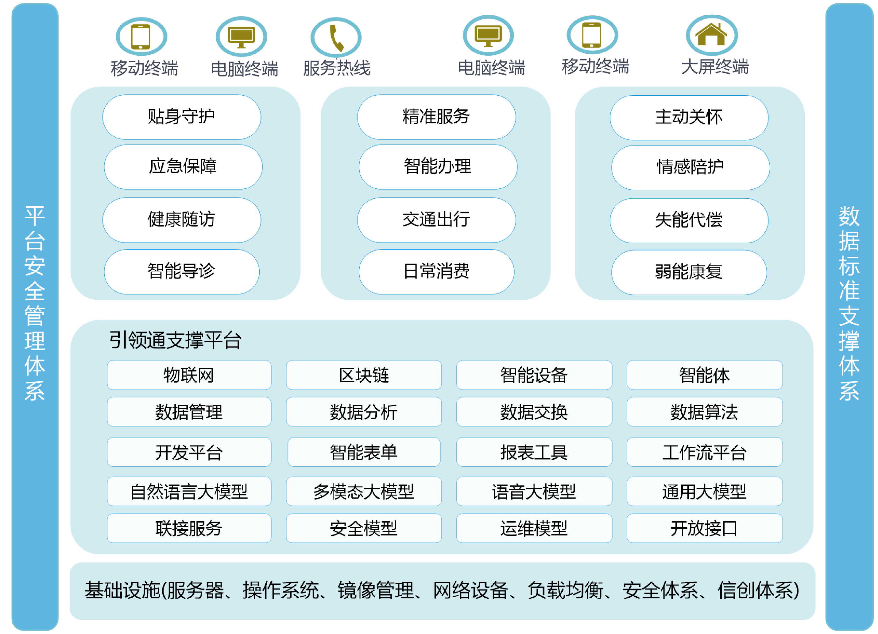 引领通数智康养系统以 “AI赋能、精准守护” 为核心,通过深度融合人工智能、物联网及大数据技术,构建覆盖健康管理、应急保障、生活服务与情感关怀的全场景智慧康养体系。系统依托AI健康评估与预警引擎,实时分析穿戴设备、环境传感器等多源数据,实现疾病风险早期预测与个性化健康干预;通过智能导诊与精准服务推荐,基于用户画像与需求理解,自动匹配康养资源与服务,打通健康服务“最后一公里”。在安全守护方面,系统具备AI行为识别与应急响应能力,可自动监测跌倒、异常行为等风险,并联动紧急联络与救援服务。同时,系统集成情感陪伴AI助手,通过智能对话、记忆互动与情绪感知,提供持续的情感支持与认知训练。借助智能流程自动化,系统还可无缝对接交通出行、日常消费、康复训练等场景,并结合数字孪生与康复路径规划,为失能、弱能群体提供个性化康复支持与能力代偿方案。通过“AI+服务+数据”闭环,引领通数智康养系统实现了从被动响应到主动关怀、从泛化服务到精准干预的升级,为用户提供有温度、有智慧、全周期的高品质康养体验。
